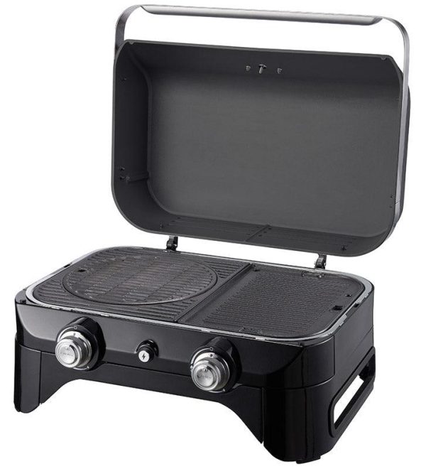 burner system. The elegant lid opens to reveal a split cast iron grid